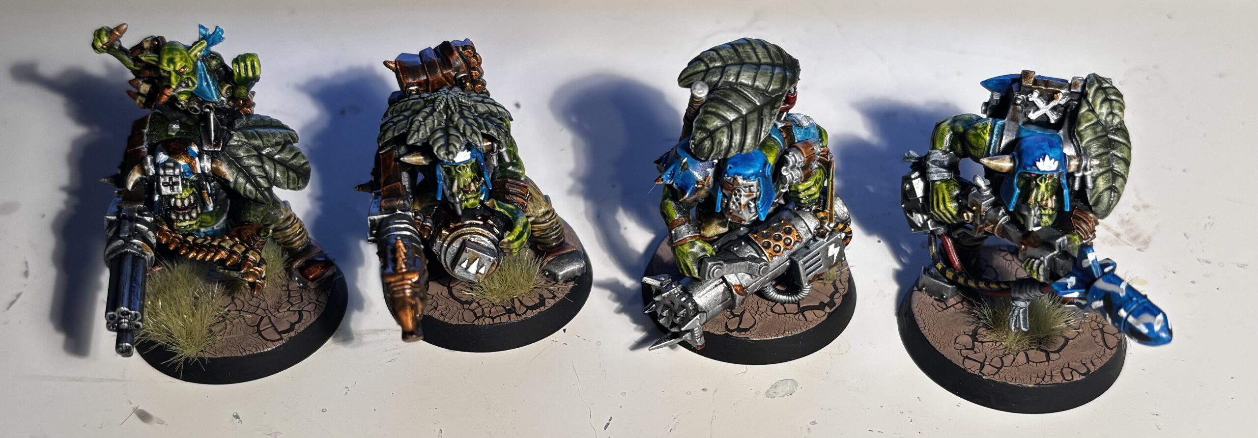 When I made my Kommandos in 5th edition, there were no official models, and much fewer options. In January I planned to add two custom shootas, a breaching ram, and a rokkit launcha, but my basement was too cold to paint in. Then, in February, I was on vacation and had a major surgery. But I’m back, and the new Kommandos are finally done!