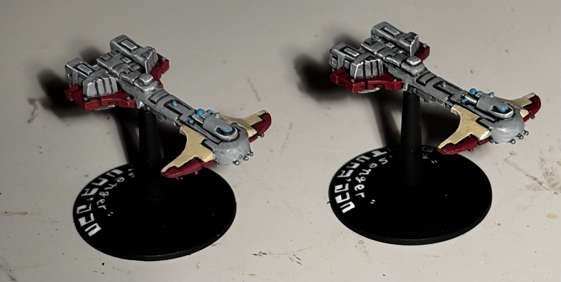 This concludes the portion of the fleet with this color scheme. The transports and orbitals will be painted the standard Tau Ochre with a brown pin wash and a simple highlight. Additionally, there will be four Nicassar Dhows, whose paint scheme I have not decided on yet. I am considering the fine line of paints from Turbo Dork, whose glittery sheen is stunning!