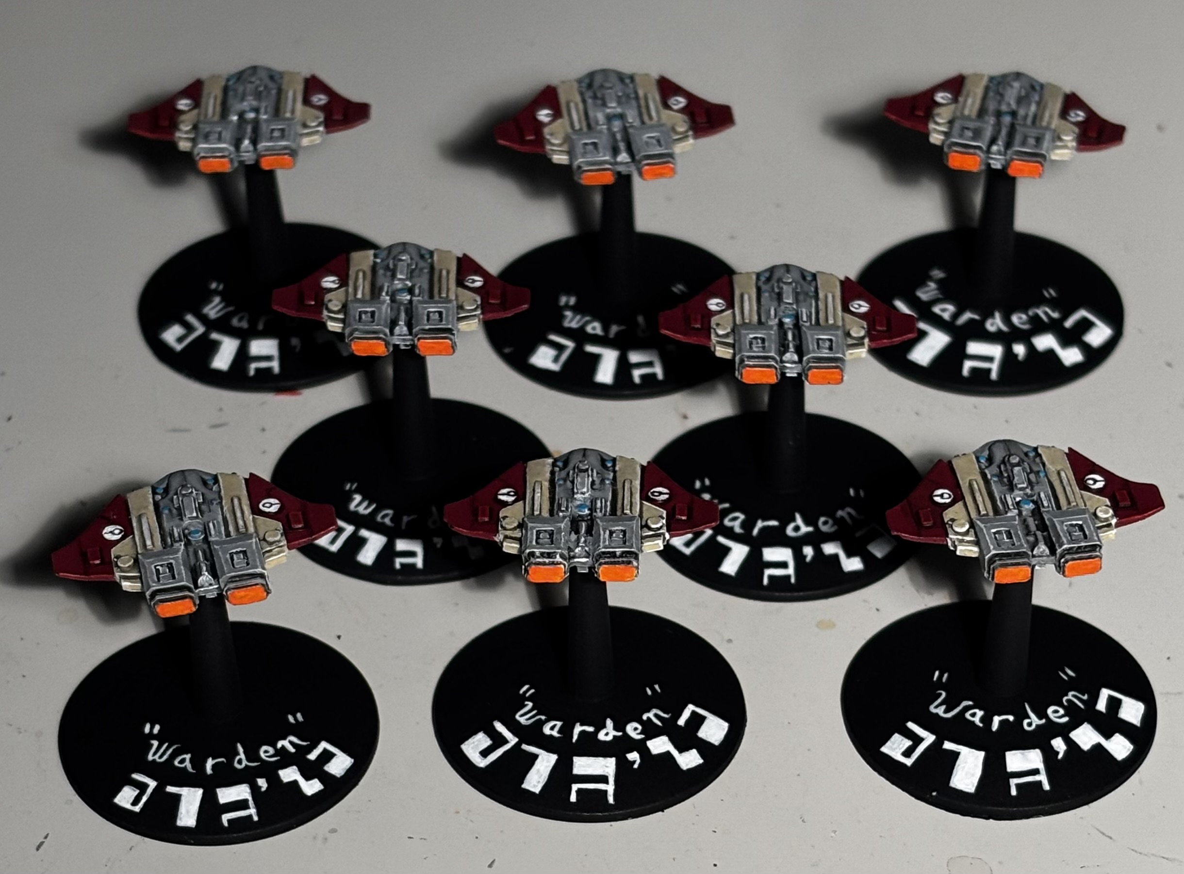 Sadly, my ambition got the better of me. My scheme was incredibly complicated, requiring black pin washes and edge highlighting over the entire model. Plus, I got it in my head to label each ship with a unique name in both T’au AND Engilsh! Hand lettered! The detail was exhausting. I gave up after completing the capitol ships and the Castellans. The Wardens, Messengers, and all other support models fell by the wayside.